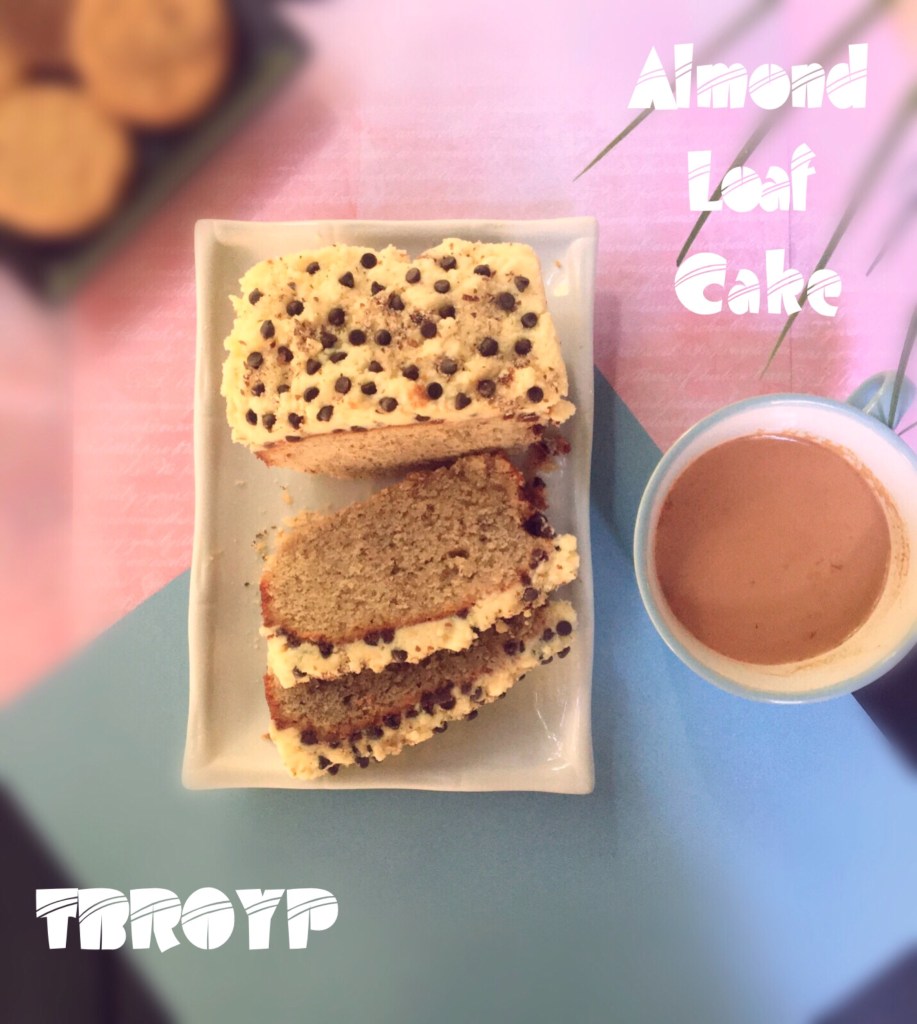 4. Layer top of loaf with frosting and top with crushed almonds and chocolate chips